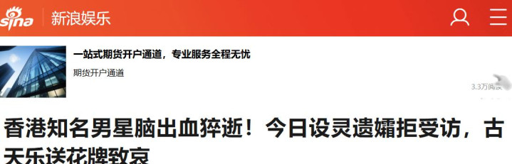 《新浪文娱:香港男星游飚脑出血猝逝 3月21日设灵古天乐送花牌默哀》