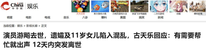《中华网文娱:演员游飚突发脑出血离世 留住11岁幼女》