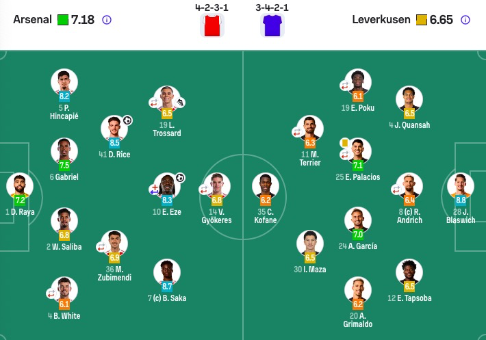 勒沃库森首发:28-布拉斯维希、4-宽萨、8-安德里希(83'6-埃兹奎尔)、12-塔普索巴、20-格里马尔多、24-阿莱克斯·加西亚、30-马扎、25-帕拉西奥斯(70'14-希克)、11-泰里耶(60'42-库尔布雷斯)、35-科法内、19-波库(60'10-蒂尔曼)
