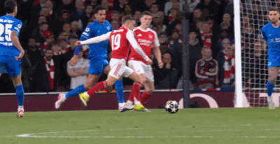 第36分钟,阿森纳中路纠合头球争顶,特罗萨德上前作念球,弧顶近邻埃泽接球回身径直爆射轰出超等宇宙波,阿森纳1-0勒沃库森。